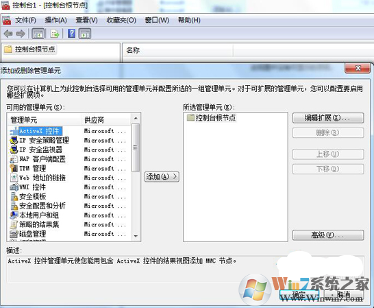 2、在“控制台”的窗口中单击“文件”,选择“添加/删除管理单元”选项。