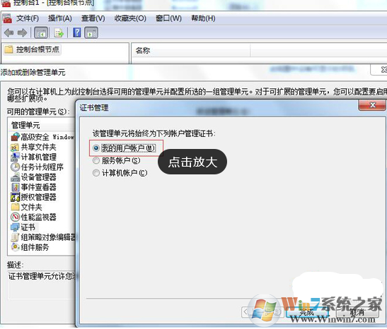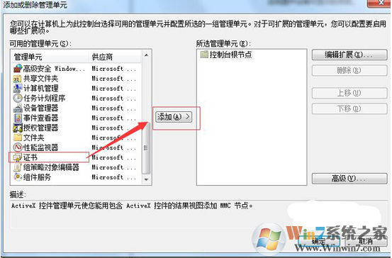 3、在对话框左侧选择“证书”,点击“添加”。