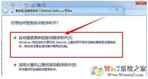 5、选择更新驱动程序,弹出如何更新系统程序,有两种更新模式,一种是自动搜索更新的驱动程序软件,另一种是浏览计算机以查找驱动程序软件。如果没有事先从显卡官网上下载最新驱动程序,可以选择自动搜索更新的驱动程序软件。如图所示: