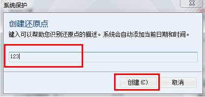3:在“系统属性”框中点击“创建”按钮,在跳出的“系统保护”框中填写还原点的名称以及描述,系统会自动添加当前日期和时间,如图2和图3所示: