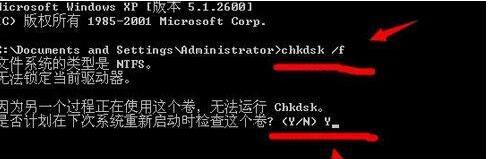 3、如果出现是否计划在下次系统重新启动时检查这个卷? (Y/N),请选择Y,然后重启电脑(重启电脑后一般进入系统前会出现蓝底白字的自检画面,请耐心等待完成即可)