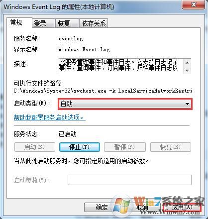 2、双击打开“Windows Event Log”服务,将启动类型修改为“自动”——点击“应用”—点击“启动”——点击"确定"即可解决。
