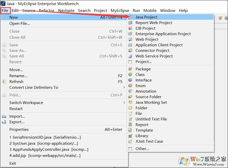 1、这里我用的是MyEclipse工具,先打开MyEclipse,然后点击导航上面的【File】菜单,然后选择New,在点击Java Project,来新建个测试工程,如下图所示。