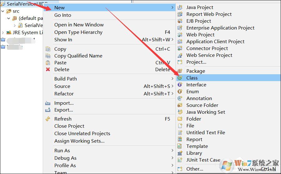 2、新建好工程后,选中新建的工程名称,然后点击鼠标右键,选择【New】,然后在右侧选择点击Class,来创建生成serialVersionUID的类,如下图所示。