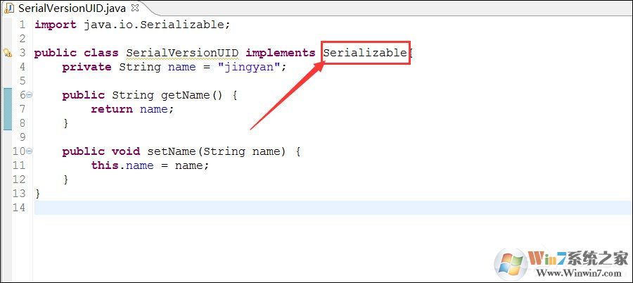 3、新建的类一定要实现Serializable这个序列化类,只有继续这个类后,才能生成serialVersionUID。继承后,在我们的开发工具里就会有黄色提醒,代码如下:
