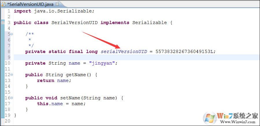 2、点击后,开发工具就会给我们自动生成了一个serialVersionUID。