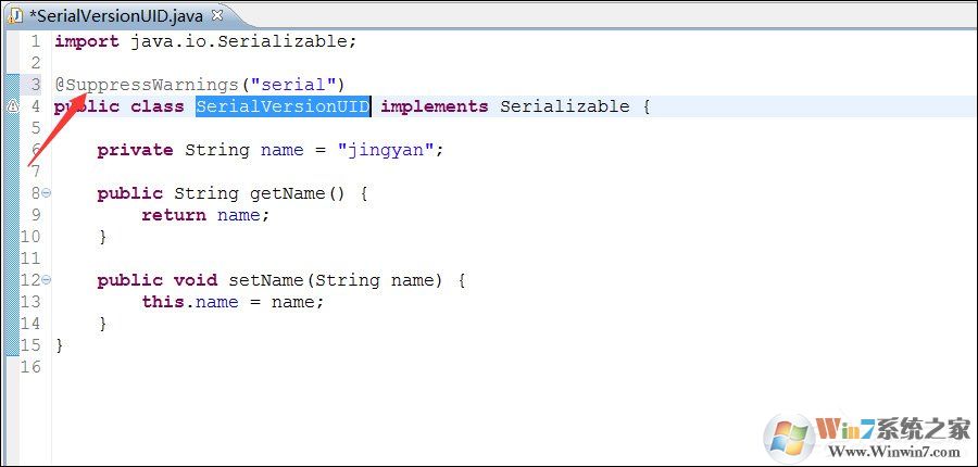 点击后,开发工具就会并没有给我们像上面一样生成一窜数字,而是在类名上面加了个@SuppressWarnings(“serial”)。这样就实现了serialVersionUID,如下图所示。