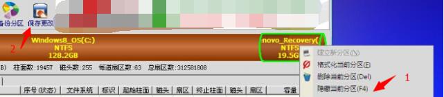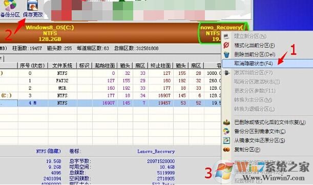 1、利用DiskGenius工具取消恢复分区(通常情况下分区名为"Lenovo_Recovery"的分区)的隐藏状态,并保存更改,最后再指派新的驱动器盘符,