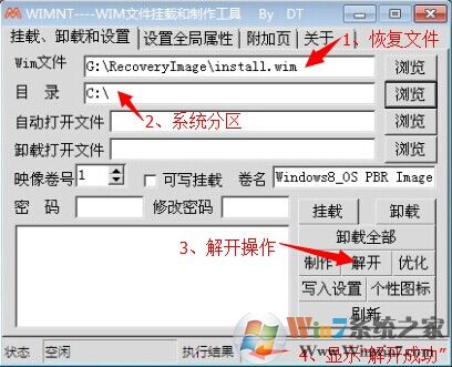 2、利用WIMNT工具还原系统,分别设置好还原文件(通常为恢复分区中的RecoveryImage\install.wim文件)、系统分区目录、解开恢复文件(通常时间为10-20分钟左右),解开完成。