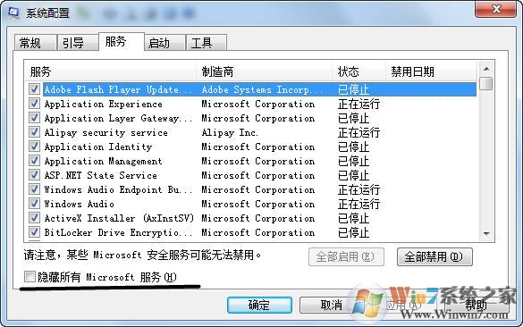3、单击“服务”选项卡,单击以选择“隐藏所有 Microsoft服务”复选框,然后单击“全部禁用”。