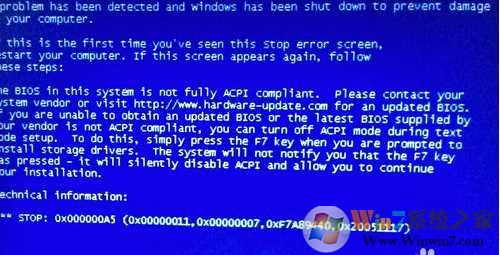 如果没有相应BIOS升级, 那么可在安装Windows系统时, 当出现”press F6 if you need to install a third-party SCSI or RAID driver”提示时, 按下F7键, 这样Windows便会自动禁止安装ACPI HAL, 而安装Standard PC HAL.如果是在安装系统时出现蓝屏代码0x000000a5,因为一键恢复程序是需要ACPI支持的,那么可以更换系统安装或者用全新版的系统安装后,再安装驱动程序。