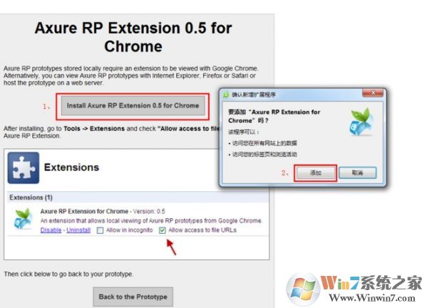 点击图中(1)处红框部位的按钮,系统会弹出“确认新增扩展程序”对话框,点击(2)处红框部位的“添加”按钮。