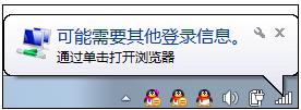Win7提示可能需要其他登录信息的时候,便是用户的无线或者网络连接到了公共网络节点,需要用户的登录信息,右下角气泡只是善意的提示,提示你只有登陆了个人信息才能上网。如果用户不喜欢这条提示,完全可以使用以下方法将其关闭: