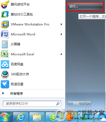 1、开始菜单选择运行,或者win+r打开运行