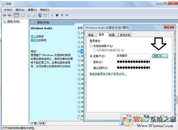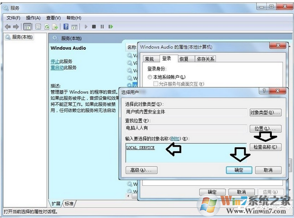 5、然后输入:lo再点击检查名称按钮,之后会搜索出来Local Service→确定→确定。然后,再去开启Windows Audio声音服务即可。