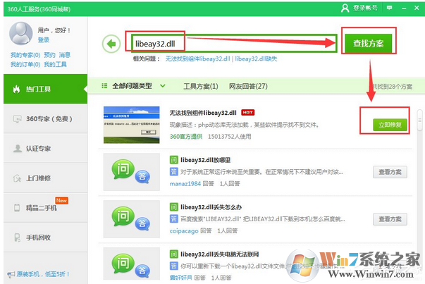 4、打开之后在输入框中直接输入“libeay32.dll”,然后点击“查找方案”,在查找到的结果当中,有一个“无法找到组件libeay32.dll”后面还跟得有“立即修复”字样,就是它了,点击“立即修复”。