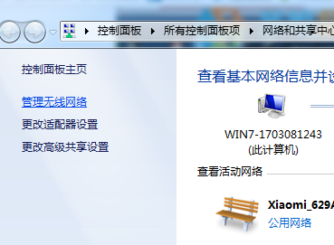 2、打开“网络和共享中心后”点击左侧面板的【管理无线网络】;