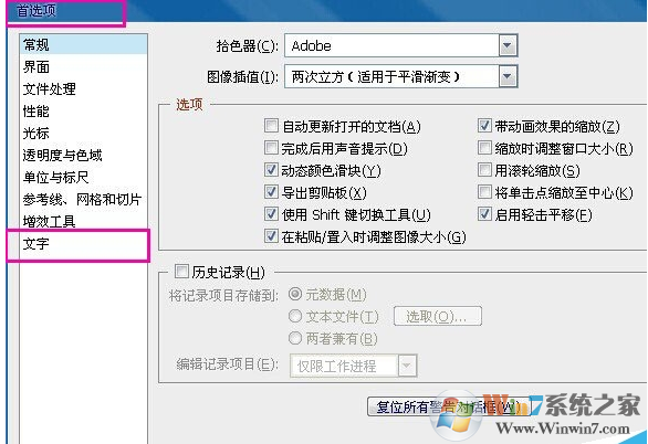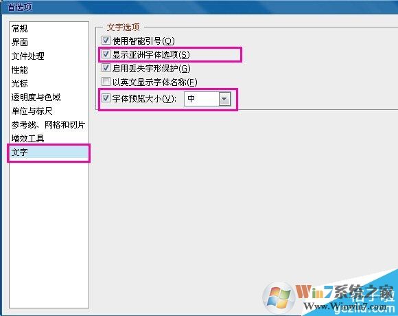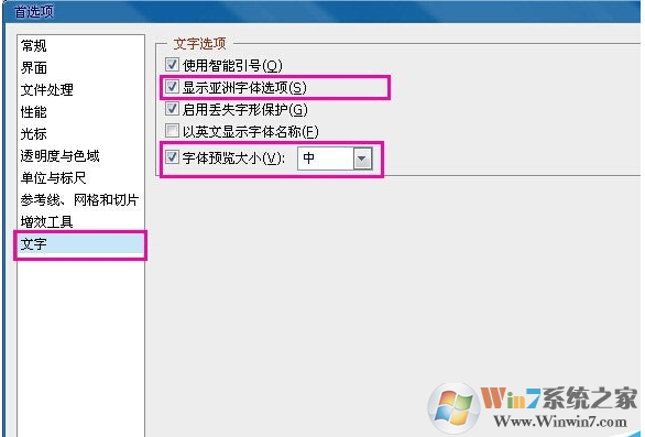 2.在该菜单左侧最下面,选择【文字】,在右侧【文字选项】下面,把【显示亚洲字体选项】和【字体预览大 小】前面,去掉勾选。