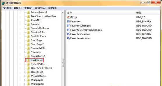 2、这时我们就进入到了注册表编辑器中,打开注册表编辑器后打开“HKEY_CURRENT_USER”文件夹,接着依次打开“Software—Microsoft—Windows—CurrentVersion—Explorer--Taskband”文件夹,如下图所示: