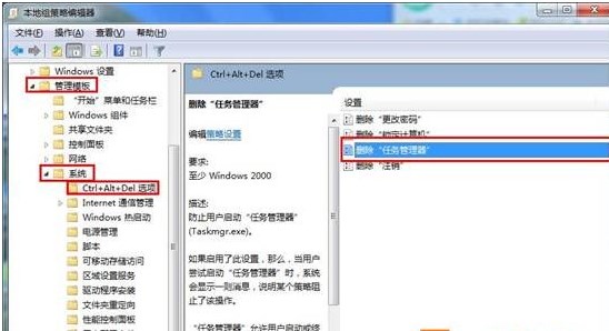 2、这时我们就进入到策略组中了,我们在【用户配置】——【管理模板】——【系统】——【Ctrl+ATL+DEL】选项下找到“删除任务管理器”;