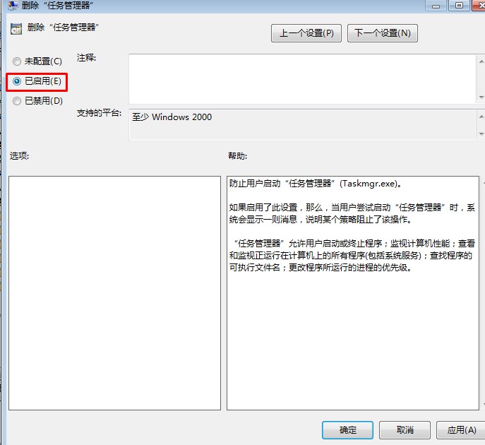 3、双打该选项,并在设置窗口中,将“未配置”设置为“已启用”,然后应用,确定保存该策略;