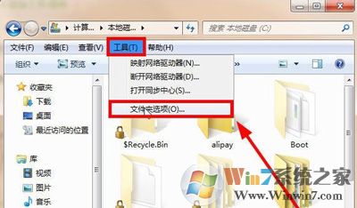 1、点击上方的“工具”,弹出下拉菜单,再点击“文件夹选项”,如图所示: