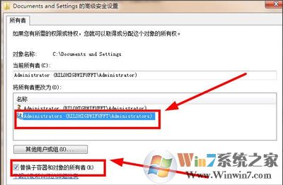 6、打开界面后,将管理员组选上,然后将下放的“替换容器和对象的所有者”前面的勾选上,确定,如图所示: