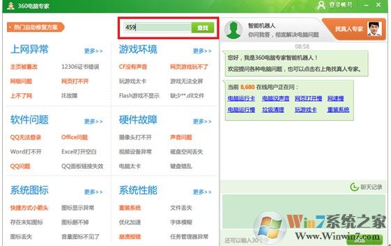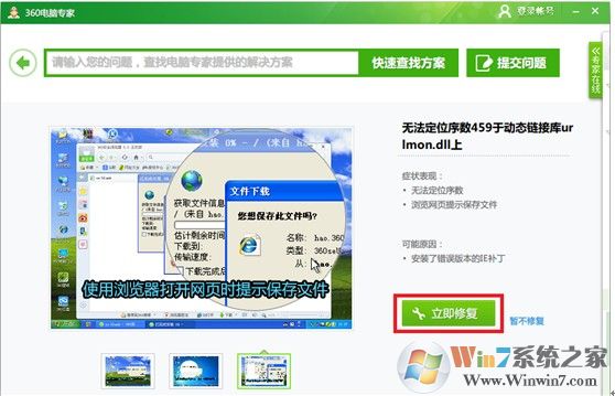首先下载最新360安全卫士,然后在主界面上方找到360电脑专家(原360电脑门诊)。点击打开后我们可以在上面找到一个搜索框,然后在其中输入“459”进行查找。这时360电脑专家会给出“无法定位序数459于动态链接库urlmon.dll上”的自助修复方案。