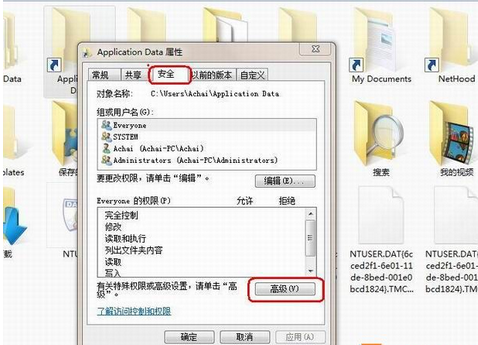 2、在该文件夹属性窗口选择“安全”选卡,然后点击下方的“高级”按钮;