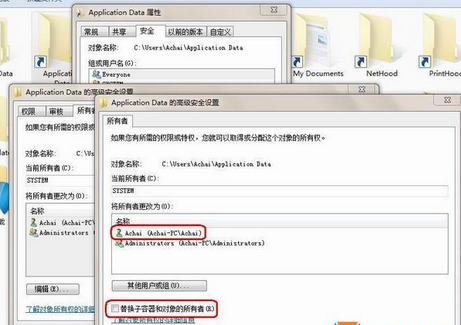4、然后点击“将所有者更改为”下方的的“Achai”然后勾选下方的“替换自容器和对象的所有者”,然后点击应用;