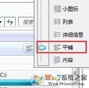 2、在弹出的菜单选项中可以改变该页面文件及文件夹的查看方式,当前是“列表”状态,所以看不到磁盘的相关信息,将其设置为“平铺”即可恢复到原来的状态;