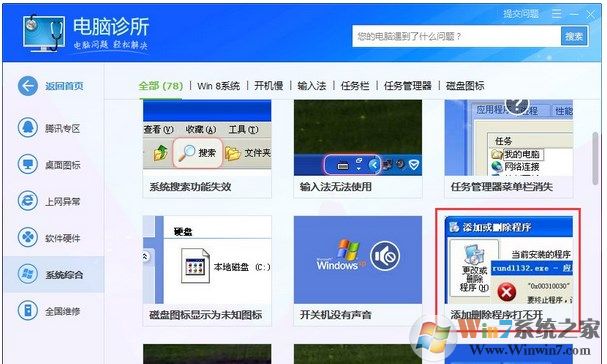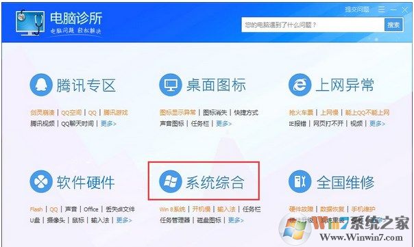 3、在电脑诊所页面直接选择“系统综合”现在可以直接在搜索栏里面搜索问题,也可以直接往下滑动页