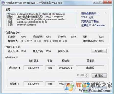 下载解压后,先运行Readyfor 4GB,当程序打开后,依次点击检查和应用选项,此时程序会告诉你所用系统能够支持最大内存容量和当前内存容量。一下的图片是笔者已经破解后所示,最大允许4GB内存。
