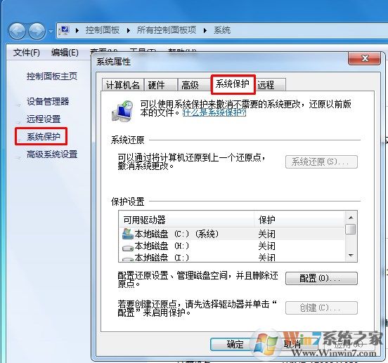 2、点击配置按钮,关闭Win7系统C盘的保护功能;