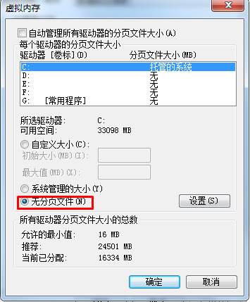 第四步:在弹出的窗口中取消勾选“自动管理所有驱动器的分页文件大小(A)”,然后设置为“无分页文件”