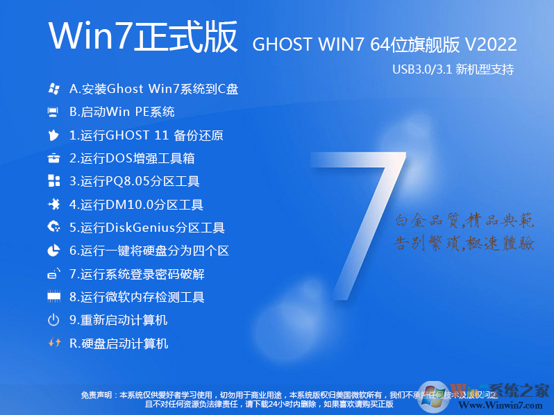 1、微软最新发布的2024年Windows7 64位镜像为母盘精心制作,稳定第一;2、自带新电脑必备的USB3.0 驱动( 包含 Intel 7/8/9/100/200/300/400系芯片组原生USB3.0 驱动、AMD 芯片组( 现有架构) 的原生USB3.0 驱动以及两种第三方芯片 USB3.0 驱动)(不会出现安装后键盘鼠标不能用的问题)