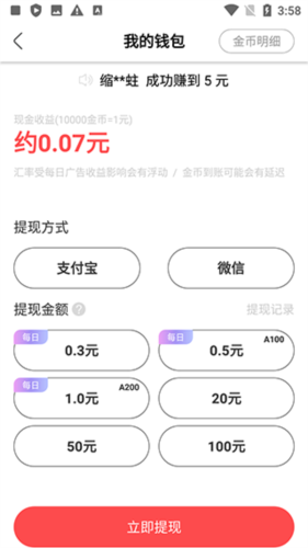 需要通过做任务和看视频赚取金币,积攒到一定的金币可以提现。