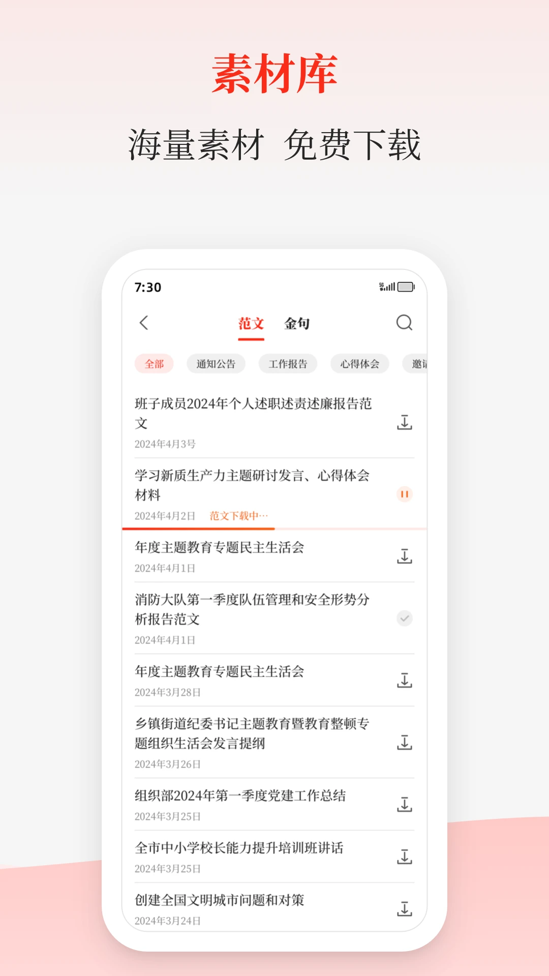 在公文写作中,素材的搜集与整理往往耗费大量时间。讯飞公文为您提供海量的素材库,让您轻松在历史文件中寻找所需内容,再也不用担心素材不足的问题。无论是经典案例、数据支撑还是专业术语,都能在这里找到。