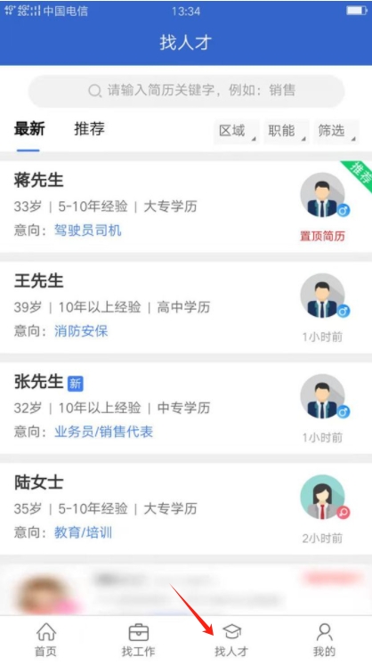 2、在找人才界面可以看到很多他人优秀简历,进行查看参考制作