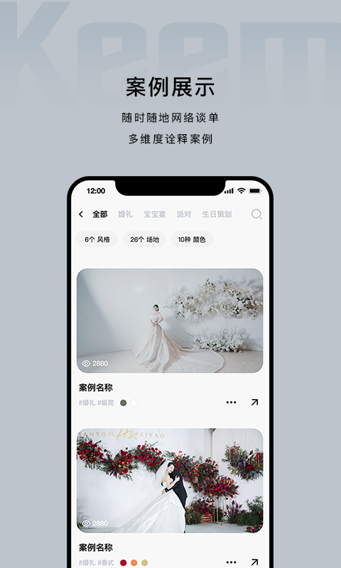 1、软件具备便捷的一键推送案例展示功能,能快速将精心准备的案例呈现给大家,方便大家直观了解婚礼策划方案,为其提供灵感和参考。
