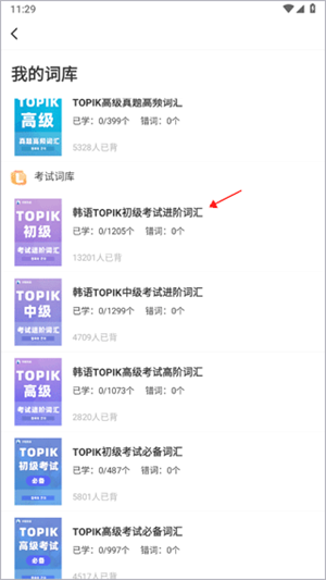 2、进入后,页面会显示多个不同分区的词库,包括延世教材、常用词库等,若需备考韩语,可选择考试词库。