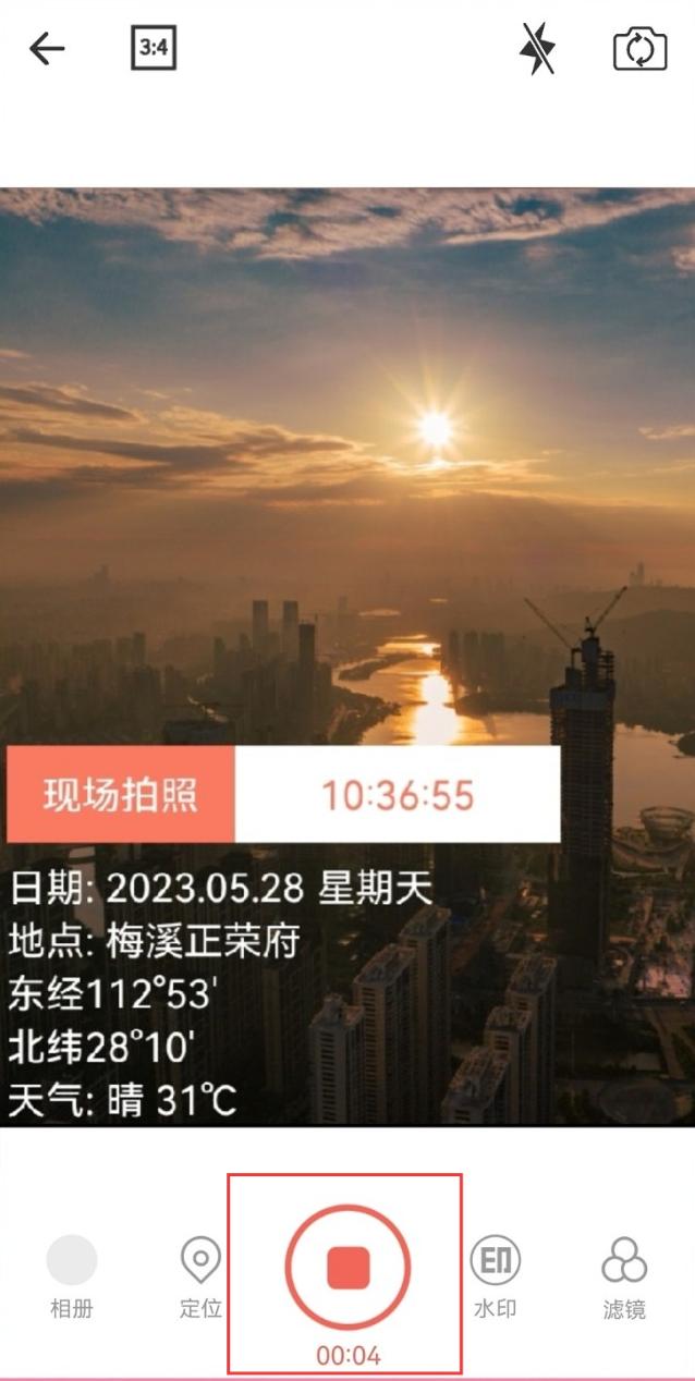 1、进入时间相机APP首页,选择视频水印相机,点击拍摄按钮,录制带时间、位置水印的视频内容。