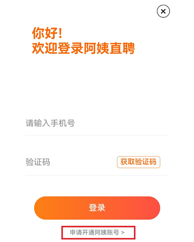 1、在登录页面点击灰色小字“申请开通阿姨账号”。