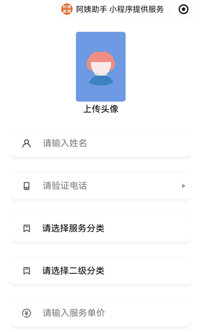 2、页面将跳转至微信小程序,按照提示上传真实头像,并填写姓名、联系电话、服务类别及服务单价。