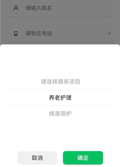 4、每个服务分类下设有不同的服务项目。以陪护为例,分为养老护理和病患陪护两种,可根据自身经验选择具体项目。
