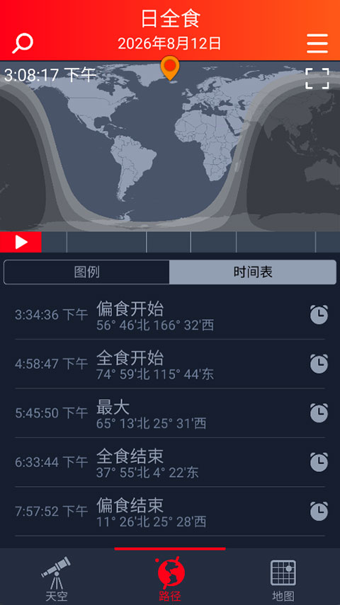 2、路径追踪:“路径”界面通过全球地图直观展示食带走向,帮助了解日食在世界各地的起始时间与地理坐标。