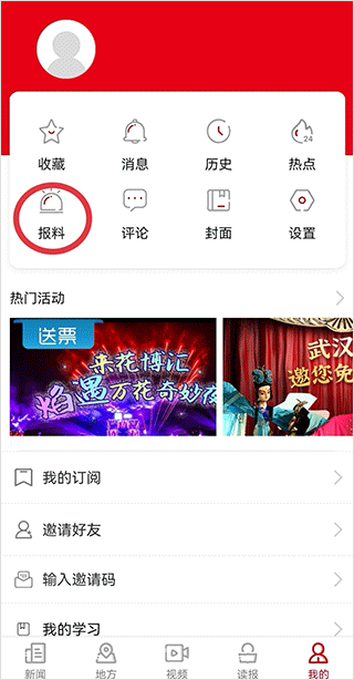 2、点击底部“我的”模块,在个人中心页面找到并选择“报料”入口。