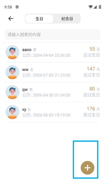 2、选择需要设置的重要日类型,点击“加号”进行添加。