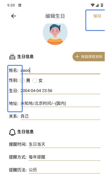 3、以生日为例,填写相关信息,包括日期、提醒时间等,确认后点击“保存”即可完成设置。