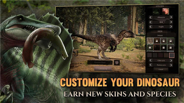 通过完成任务和杀死其他人,以幼崽的身份开始生活并成长为成年。增强力量和力量以应对更大的生物和更大的挑战。当您在世界上留下自己的印记时,看着您的恐龙无缝地长出它们的角、板、刺和牙齿!